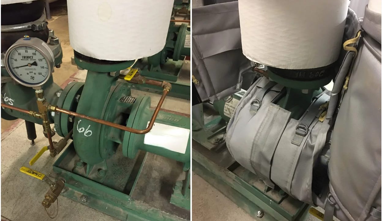 除了一些采用蒸汽或空气移动冷凝水的离心泵式冷凝水接收器外,为了实现最大能源效率,应对使用蒸汽或空气移动冷凝水的冷凝水泵进行隔热。冷凝水泵只是复杂冷凝水系统的一部分,任何一个薄弱环节都可能影响能源效率。因此,泵、冷凝水管道和冷凝水箱应进行隔热,以避免冷凝水中的热能丧失。这些冷凝水系统中的组件通常超过了最高温度阈值120°F,超过这个温度会影响能源效率,因此降低这个温度是重要的。对冷凝水泵进行隔热还可以提高工厂的安全性,因为工人免受热冷凝水系统的伤害。